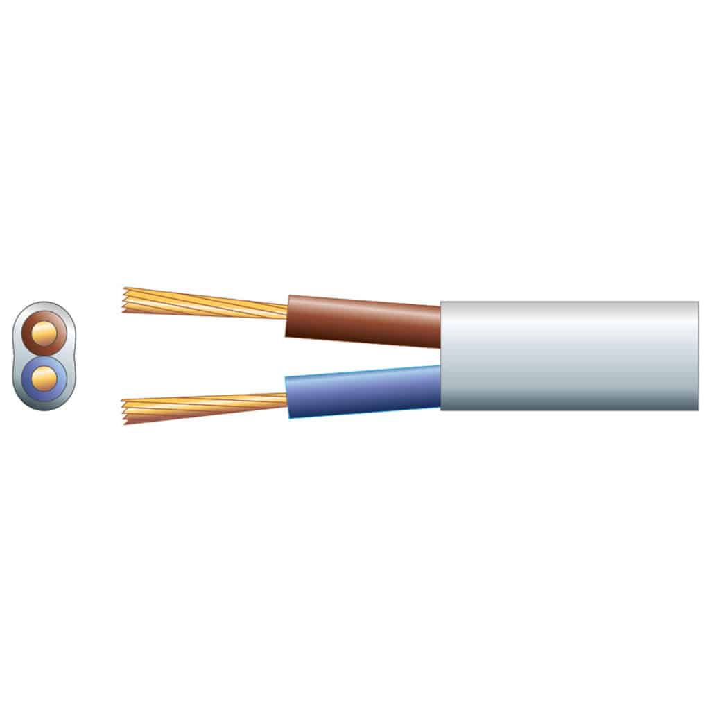 Oval profile mains electric cable. Flexible PVC sheath for use in light electrical applications. BSI approved to BS6500, VDE approved.