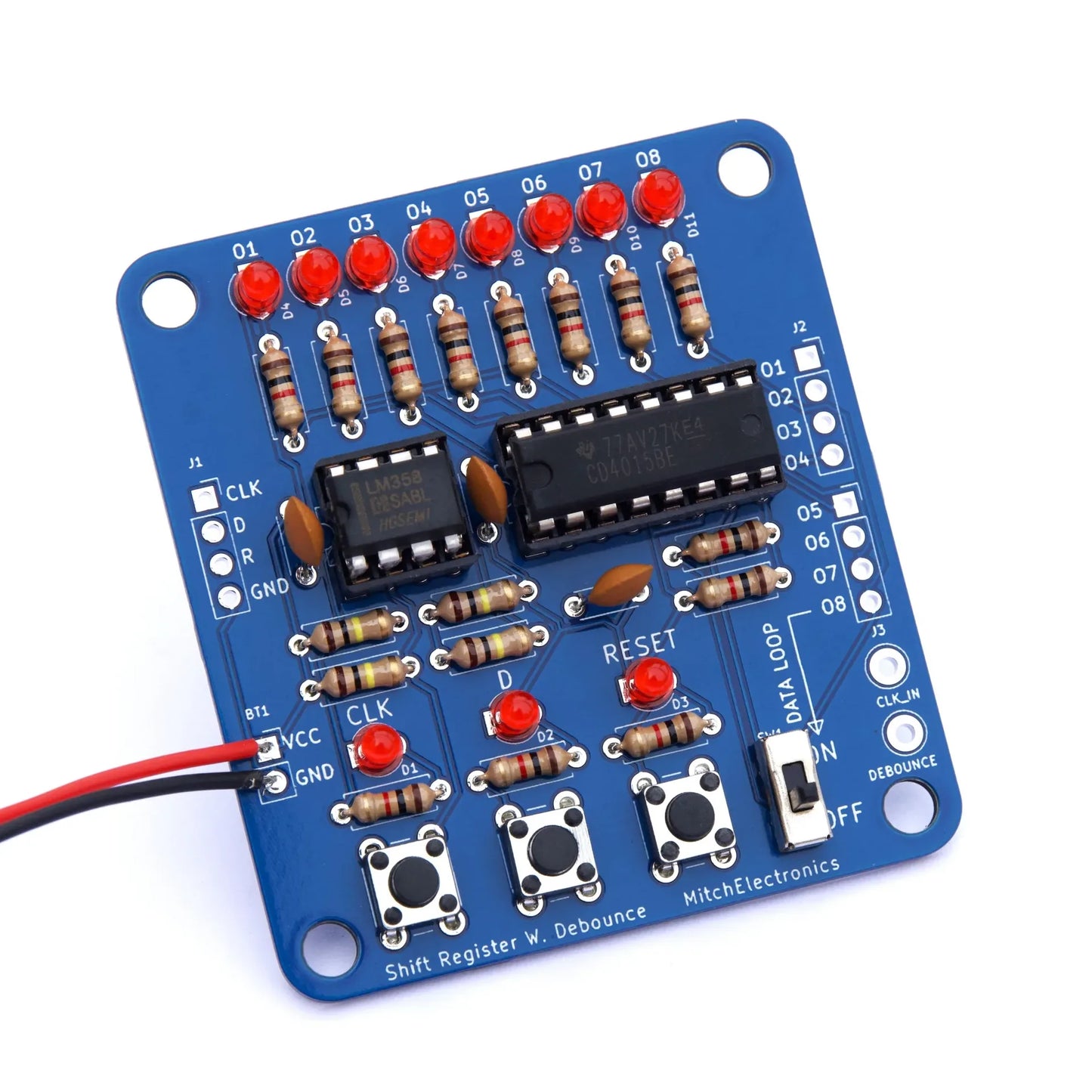 The Board is a simple kit that lets you get soldering experience while also learning about the 4015 shift register. Instead of having two independent shift registers, the 4015 combines them into a single 8-bit shift register, thus demonstrating how shift registers can be chained together.