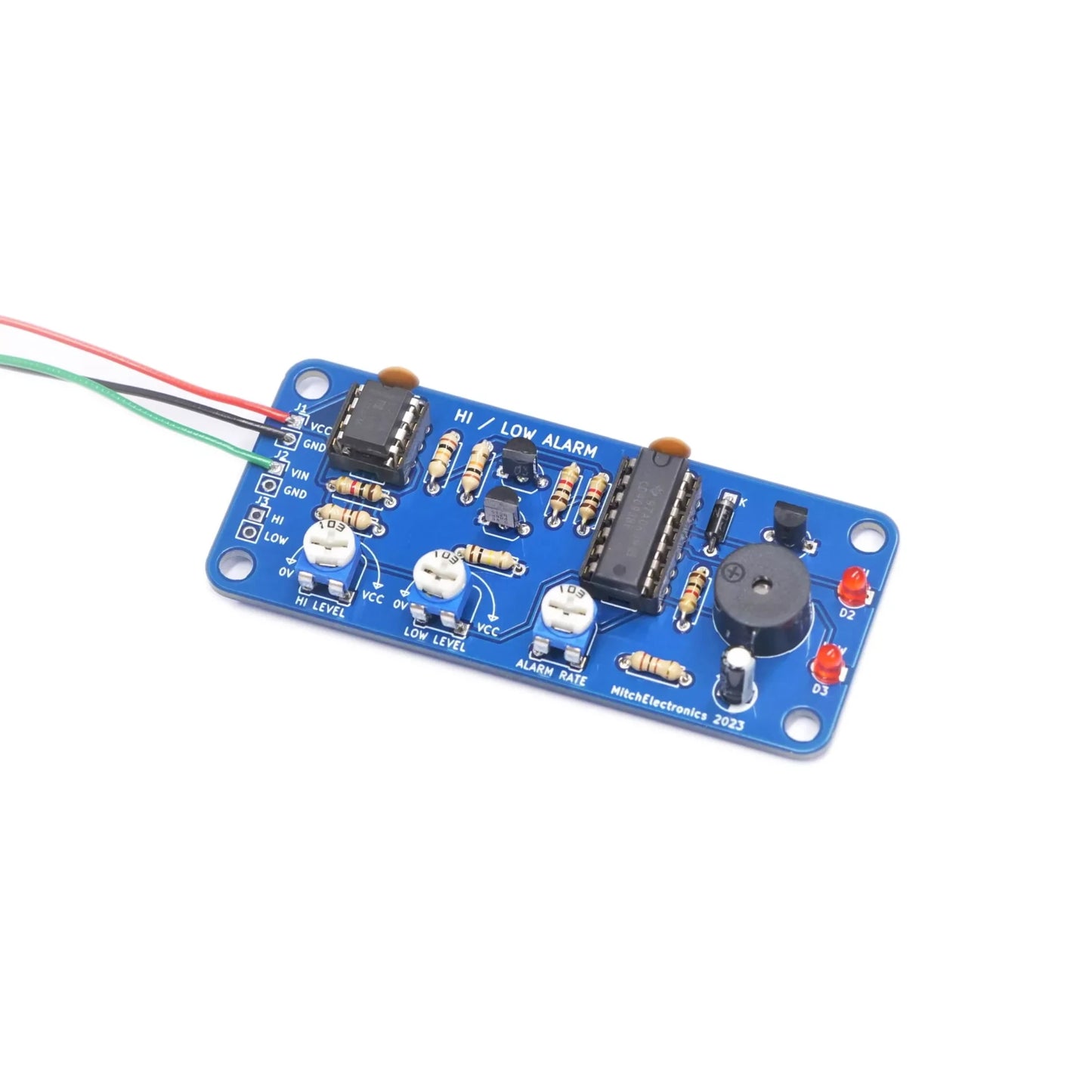The Hi-Low Alarm Kit by MitchElectronics lets you build a device that triggers an alarm upon detecting if an input voltage has become too small or too large. Perfect for beginners and those needing a practical alarm circuit!