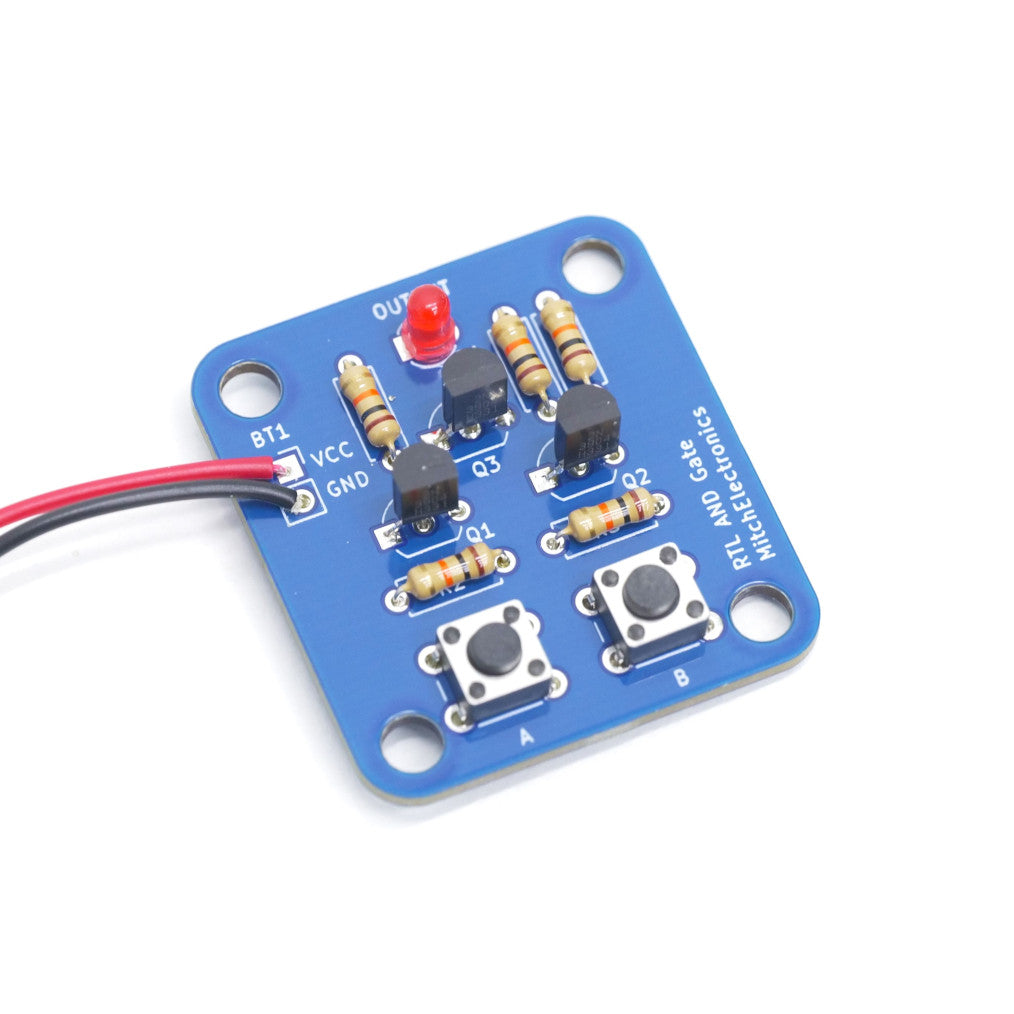 The RTL AND Kit is part of the MitchElectronics RTL Kit range, designed to teach the fundamentals of binary logic through discrete components. This kit demonstrates the operation of AND gates with transistors, resistors, and LEDs. The tactile buttons serve as inputs, and an LED indicates the output, allowing you to observe how the AND gate works in real-time. Ideal for educational purposes, hobbyists, or as a foundation for building more complex circuits when combined with other RTL kits.